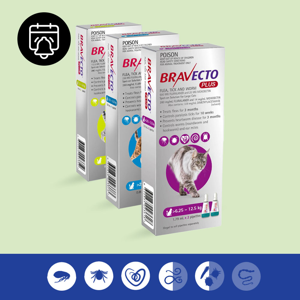 The Convenience Cat Package provides the most complete parasite protection. Bravecto PLUS provides protection against ticks, fleas, ear mites, heart worm and most intestinal worms. It does not cover whip worm or tapeworm. Whip worm infestations, although possible, are not as common in cats, however it is important to cover against tapeworm, especially if your cat has access to outdoors and/or is a hunter as they have an increased risk to the zipper tape worm (Spirometra tapeworm) carried by lizards (incl. geckos), frogs and snakes. By giving Bravecto PLUS with a tape-wormer your pet will receive protection against the most common intestinal parasites.