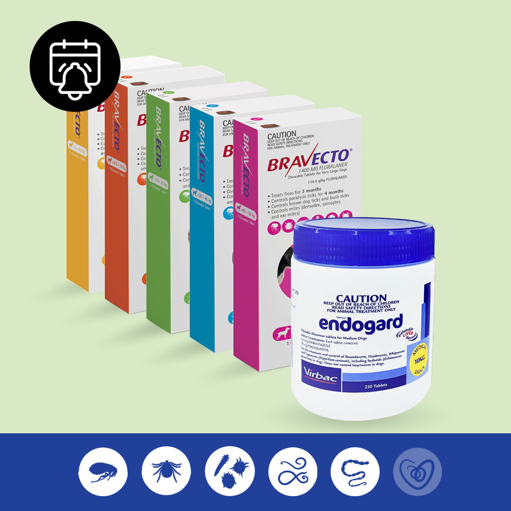 The convenience package is put together to offer full coverage protection with the most convenient schedule in mind. Bravecto provides protection against ticks, fleas and mites. The all-wormer (Endogard) provides protection against all the common intestinal parasites (roundworm, hookworm, whipworm and tapeworm). This package does not cover against heartworm, however, is designed to work well with those pets receiving the annual heartworm injection (pro-heart SR-12).